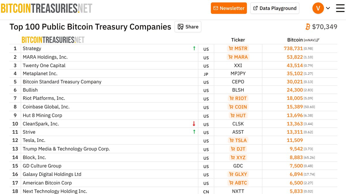 The BitcoinTreasuries leaderboard at $70,349 per Bitcoin shows the concentration at the top of corporate treasury accumulation. Strategy holds 738,731 BTC at rank one, a holding so large it represents more than the next seventeen companies combined. MARA Holdings at 53,822 and Twenty One Capital at 43,514 occupy ranks two and three. Strive’s 13,311 at rank ten sits in a cluster with CleanSpark at 13,363 and Hut 8 at 13,696 where a few hundred BTC separates each position.