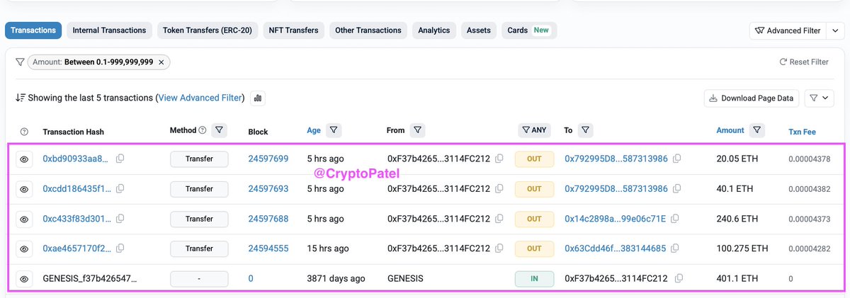 Then, within the last 24 hours, the wallet began moving funds across four separate outbound transactions. The Etherscan data shows transfers of 100.275 ETH, 240.6 ETH, 40.1 ETH, and 20.05 ETH, all sent to new addresses within a five-hour window. The full 401.1 ETH position has now left the original wallet.