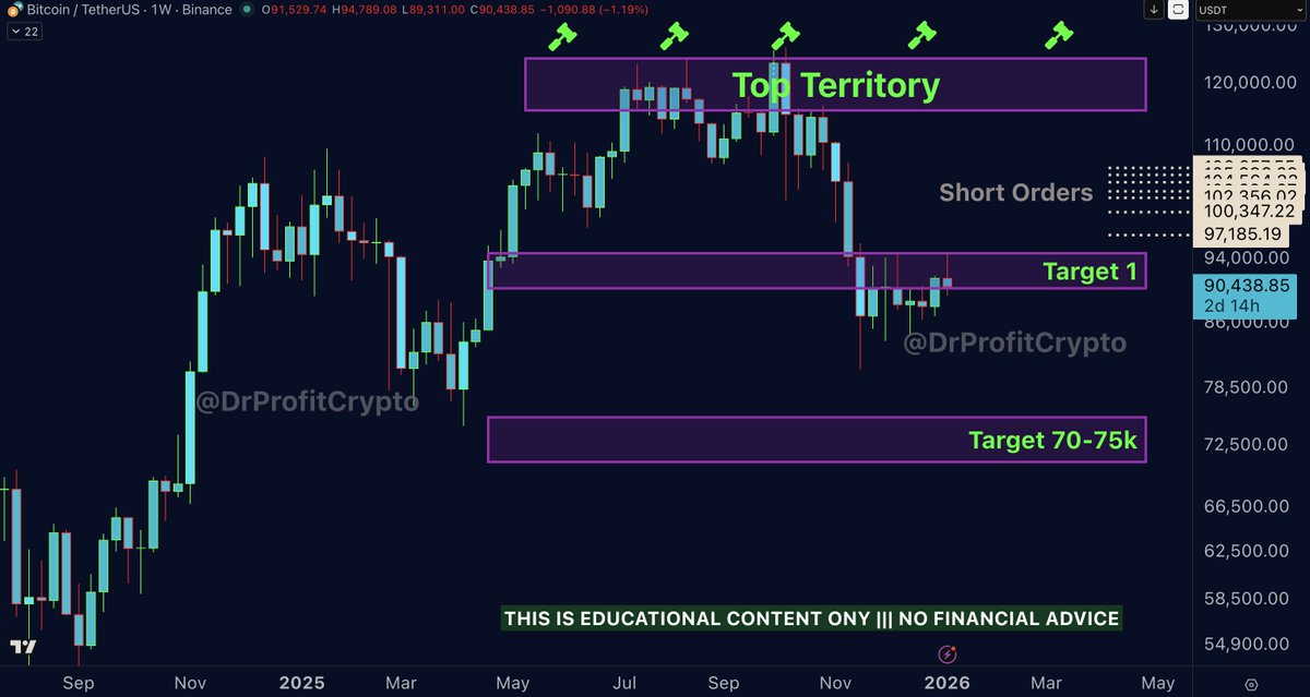 The next major downside target is now clearly defined. Doctor Profit points to the $70,000–$75,000 zone as the primary bearish objective if current conditions persist. That area is marked as the next target on the chart, positioned well below the recent consolidation range.