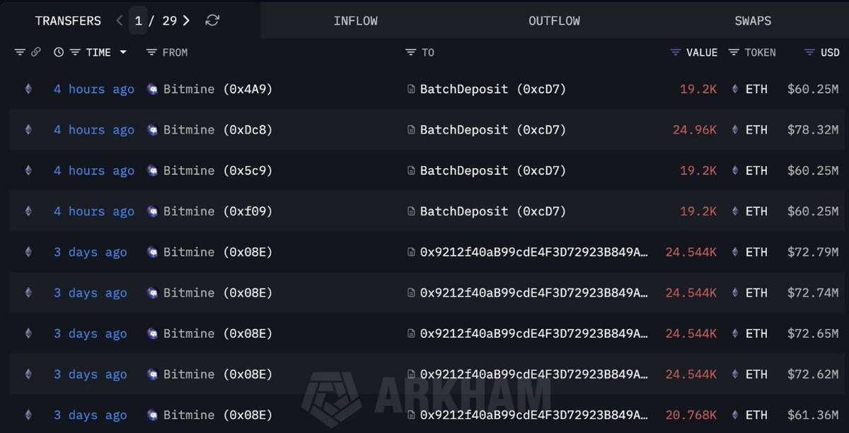 The repeated appearance of Bitmine-associated addresses in the transfer list suggests the firm is systematically deploying capital into staking, rather than testing the mechanism with a small allocation. Each entry reflects direct inflows to the staking contract, confirming that the ETH is being locked for network validation rather than moved through intermediaries.