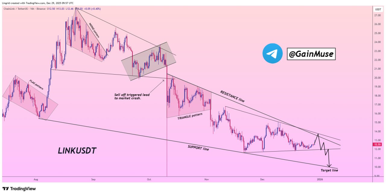 A new technical analysis shared by crypto trader Gain Muse shows Chainlink respecting a well-defined descending channel that has guided price action for months. Repeated recovery attempts inside this structure have failed, reinforcing the dominance of the downward trend.