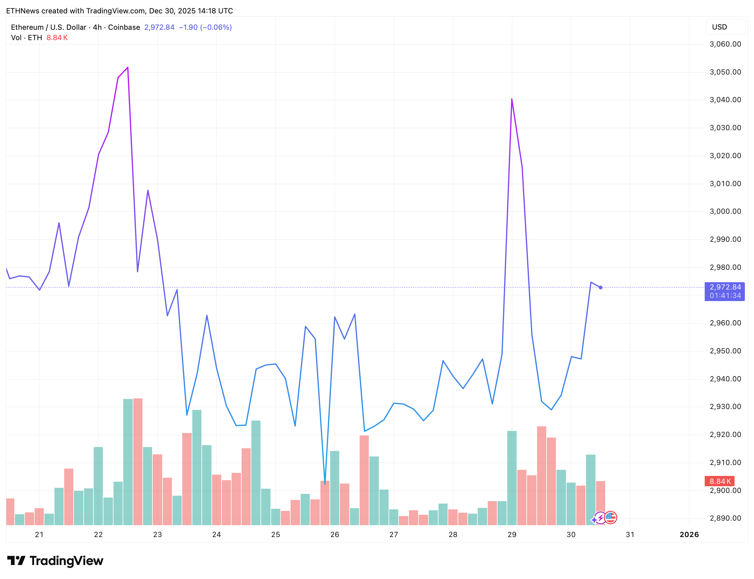 The TradingView 4-hour ETH/USD chart reinforces this view. Price is currently hovering around $2,972, following a sharp spike that was quickly rejected. That move lacked follow-through, and the subsequent pullback brought price back into a narrow range near prior support.