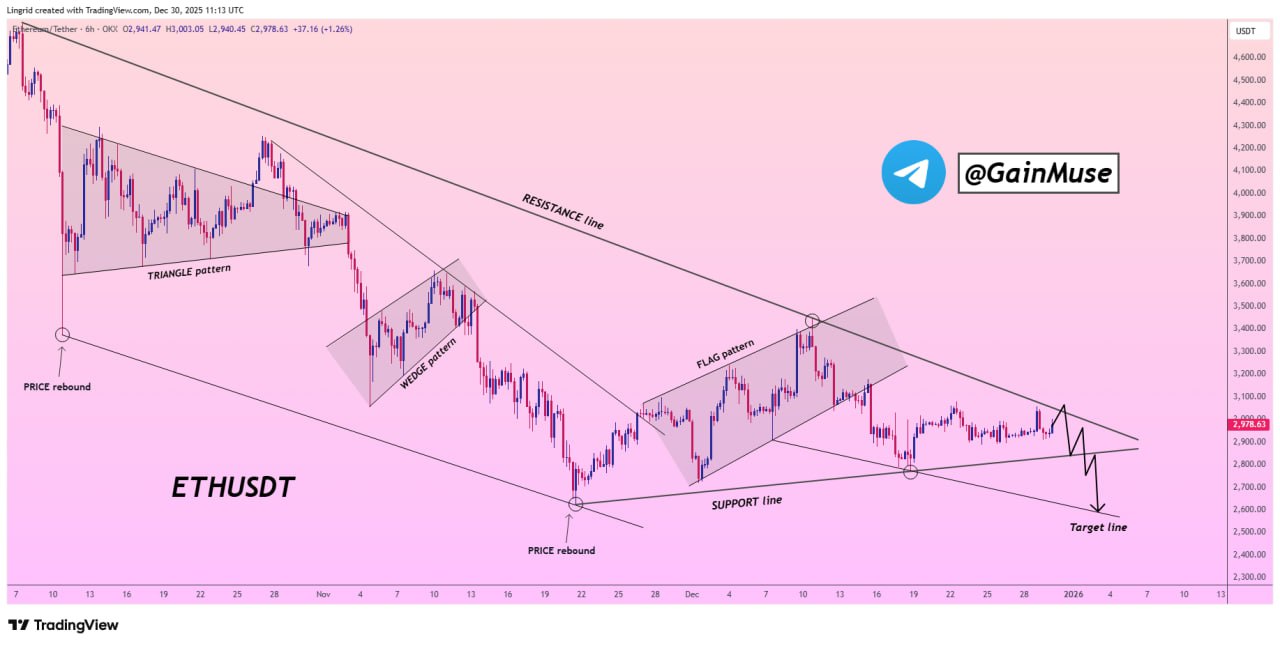 The broader structure on the GainMuse chart highlights a sequence of failed recoveries within a clearly defined downward channel. After breaking below earlier consolidation zones and losing the upward channel, Ethereum attempted multiple rebounds, each time stalling beneath the descending resistance line. These failed attempts point to weakening momentum rather than accumulation, with price compressing closer to underlying support.