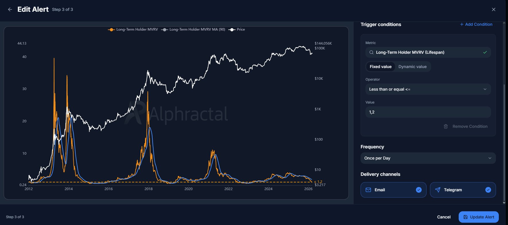 Wedson has set an alert on the Long-Term Holder MVRV at the 1.2 level, visible in the Alphractal alert configuration shown in the second image. The trigger condition is set to less than or equal to 1.2, delivered once per day via email and Telegram. That level sits above the projected 0.85 floor, giving him advance warning if the metric begins moving toward the opportunity zone rather than waiting for it to arrive before acting.