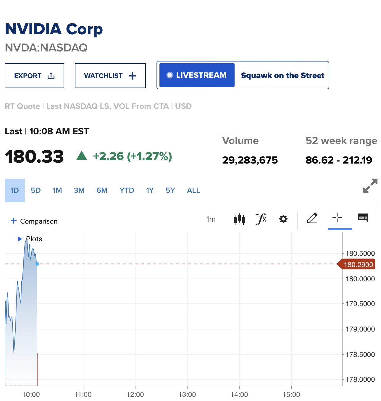 The intraday chart shows Nvidia recovering from early-session weakness and reclaiming the $180 area, a key psychological level for short-term traders. Volume during the rebound remained elevated, suggesting active participation rather than a low-liquidity bounce.